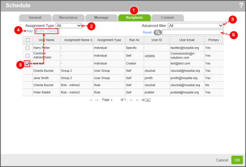Note: In the example below, the grid displays one row per recipient assigned. However, you may notice that a recipient may be listed more than once. A user may be assigned to a schedule through different assignments (e.g. individual, roles and user groups). Where there are multiple assignments for a recipient, there may be conflicts between the definitions that determine the method of execution (i.e. run as). To avoid conflicts, the system will designate a "primary" status to one assignment to indicate which schedule setting to use. Primary status is given to assignments based on a hierarchy of Assignment Types. Roles is considered the base and is overridden by User Group then finally by Individual assignments.